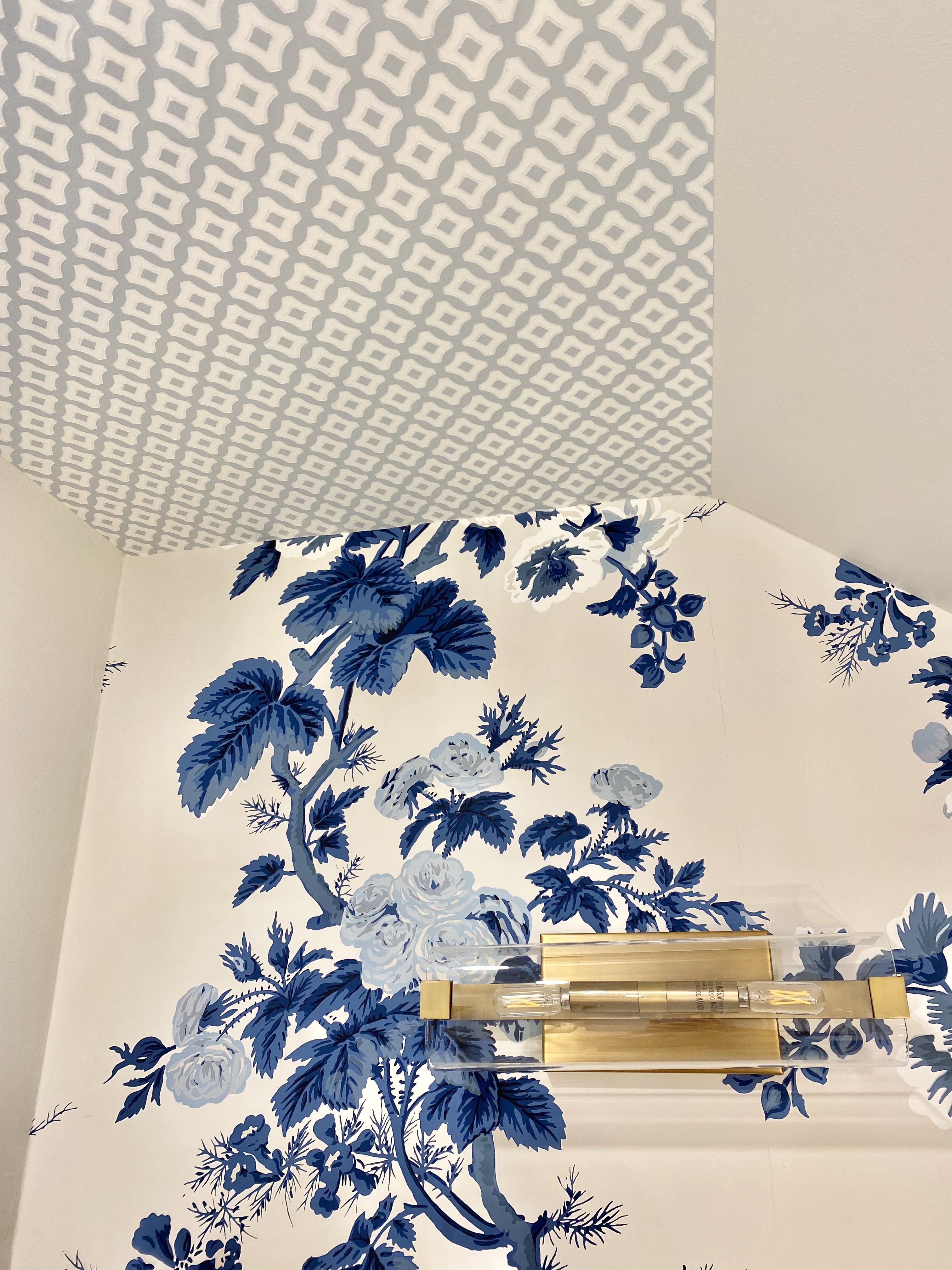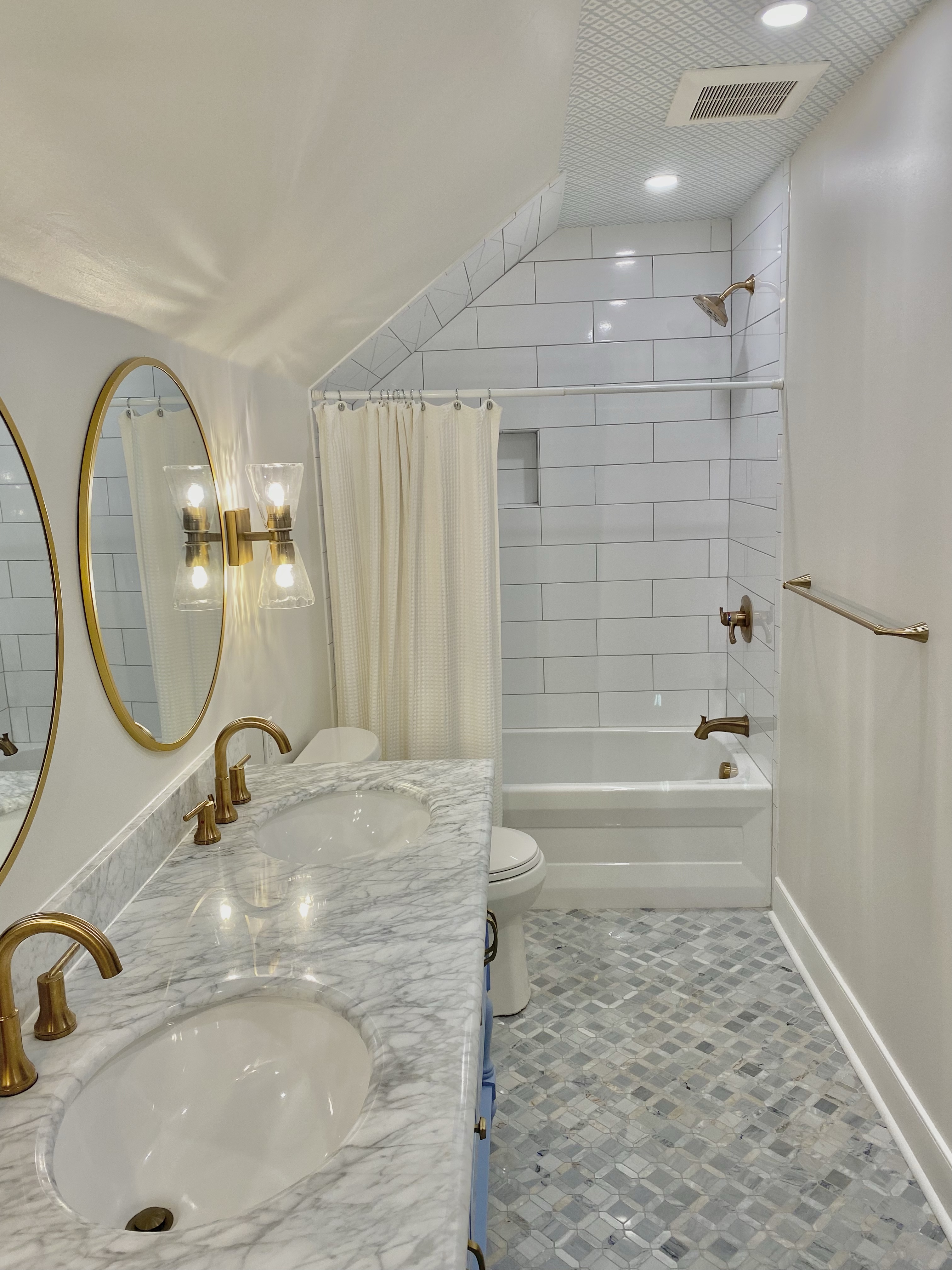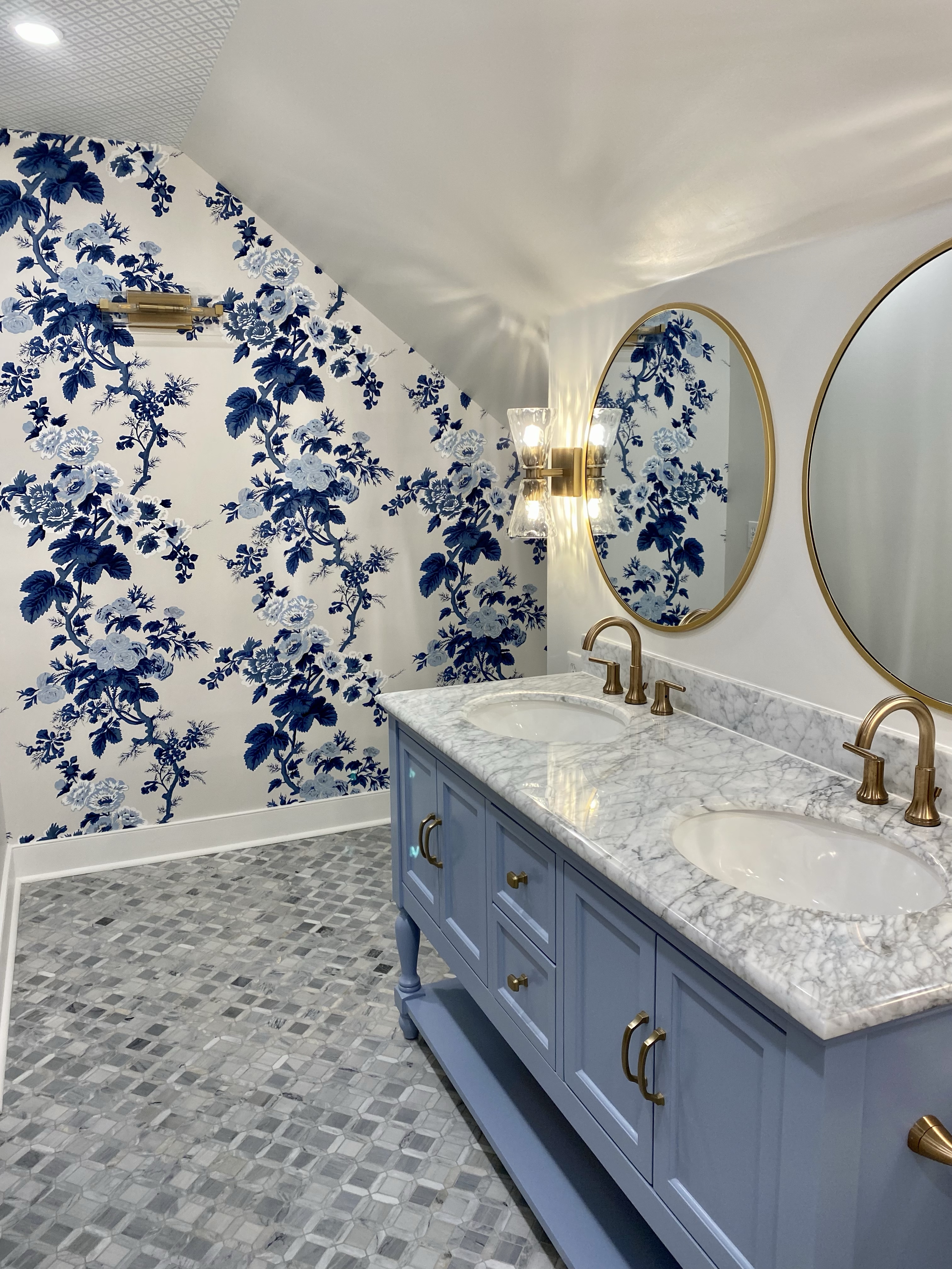 Attic Bath Vanity – DEAL! Floral Wallpaper Diamond ceiling wallpaper Mirrors Faucets Sconces Floor tile Tub tile Shower fixtures Towel bar Toilet paper holder