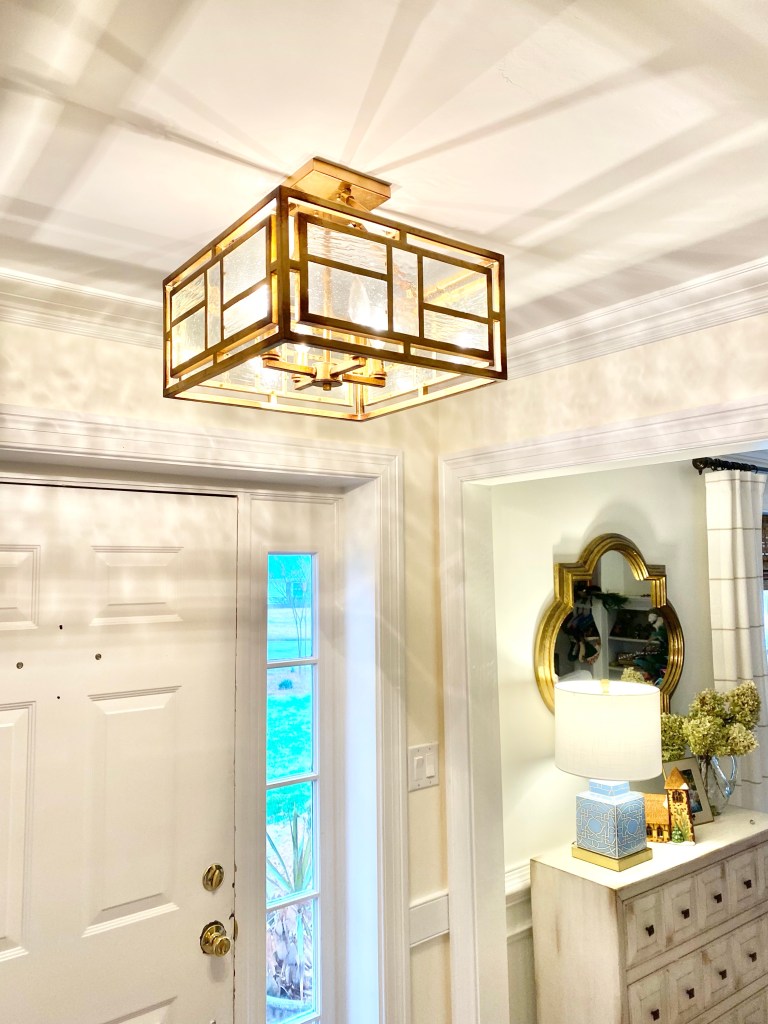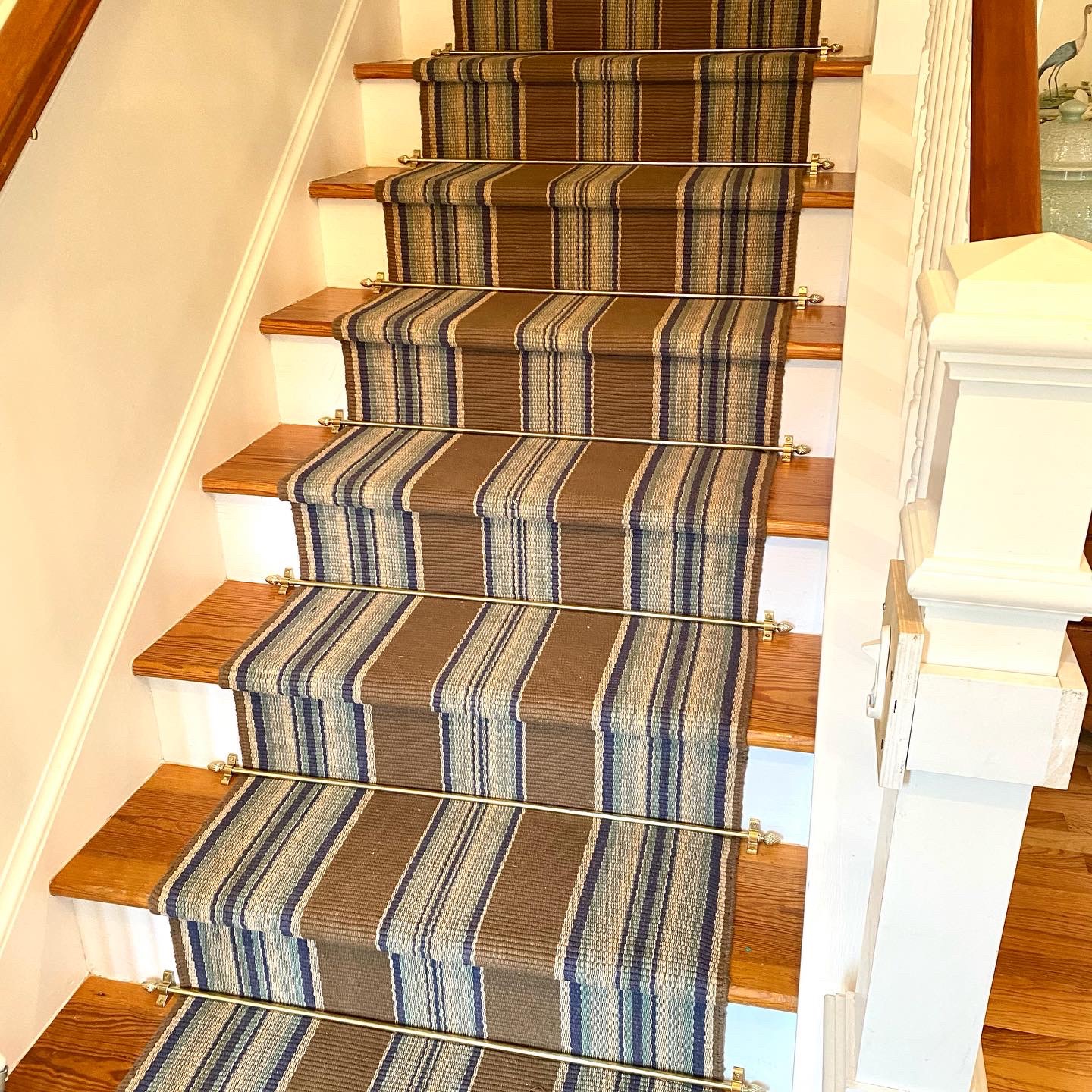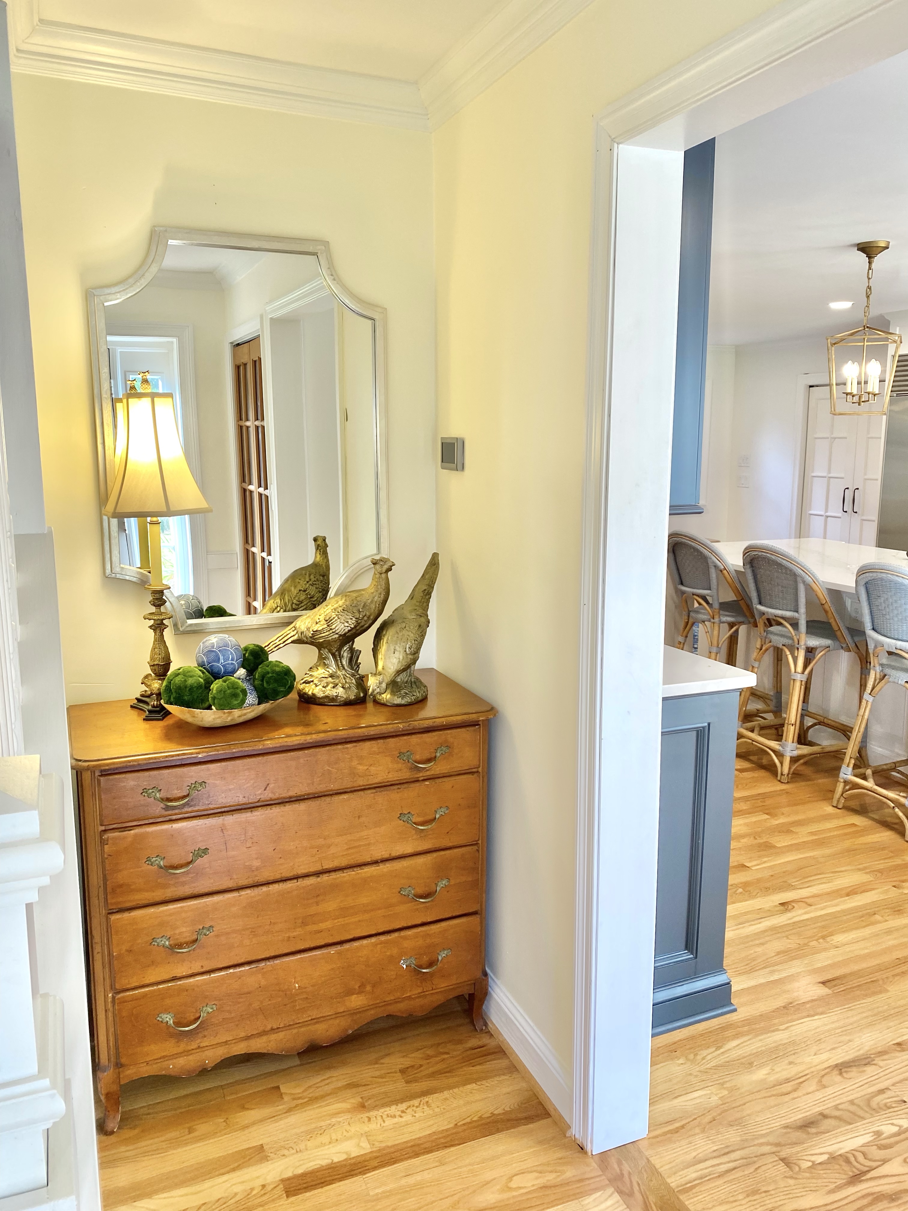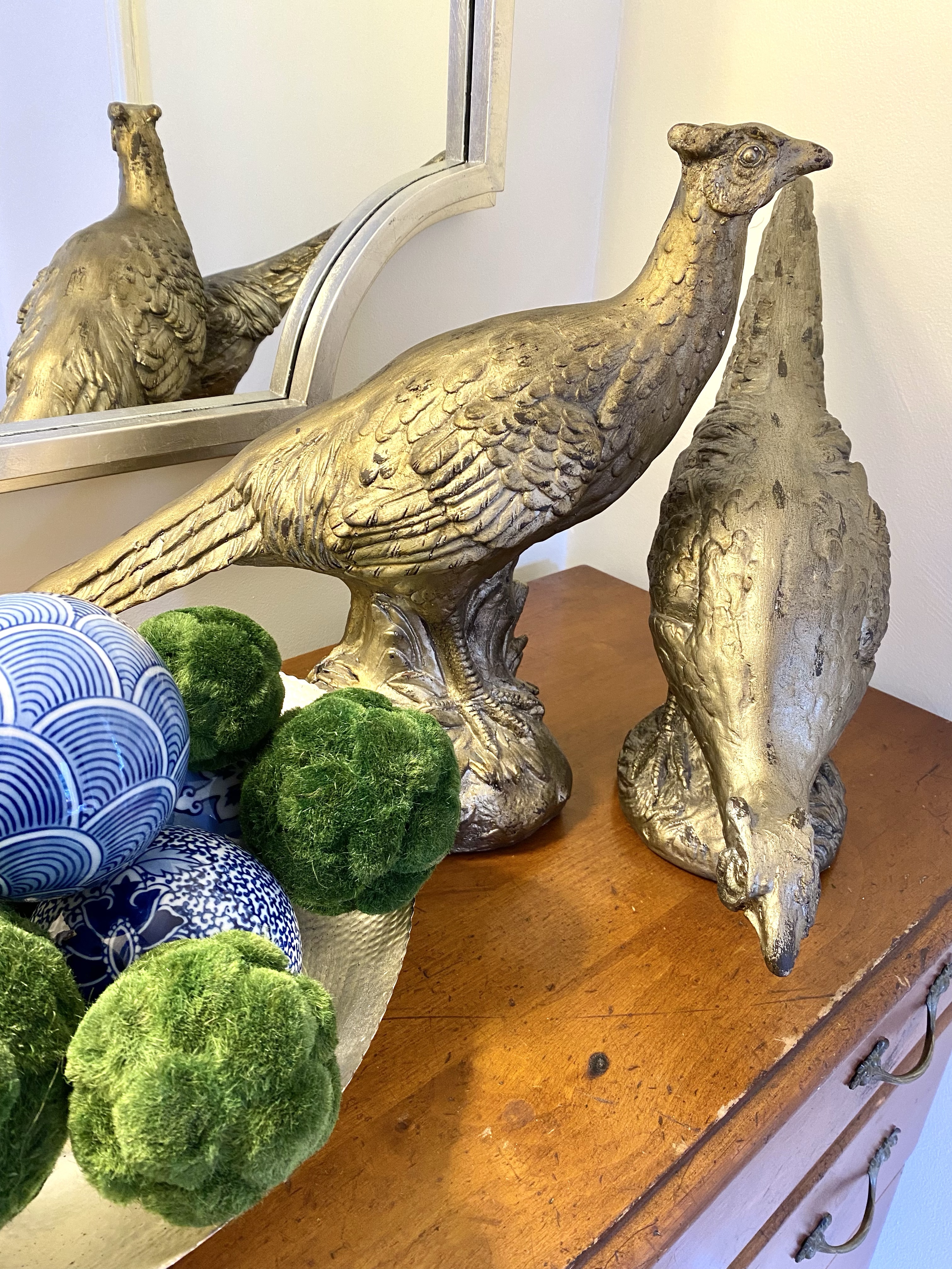Foyer Stair runner rugStair rodsSisal entry rugFlush mount lightMoss ballsBlue decor balls (similar)Pheasant statues looking glass spray paint (use to make antique mirror glass on closet door)