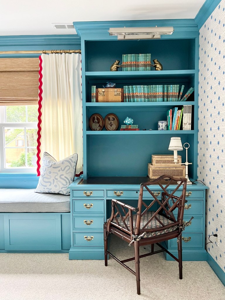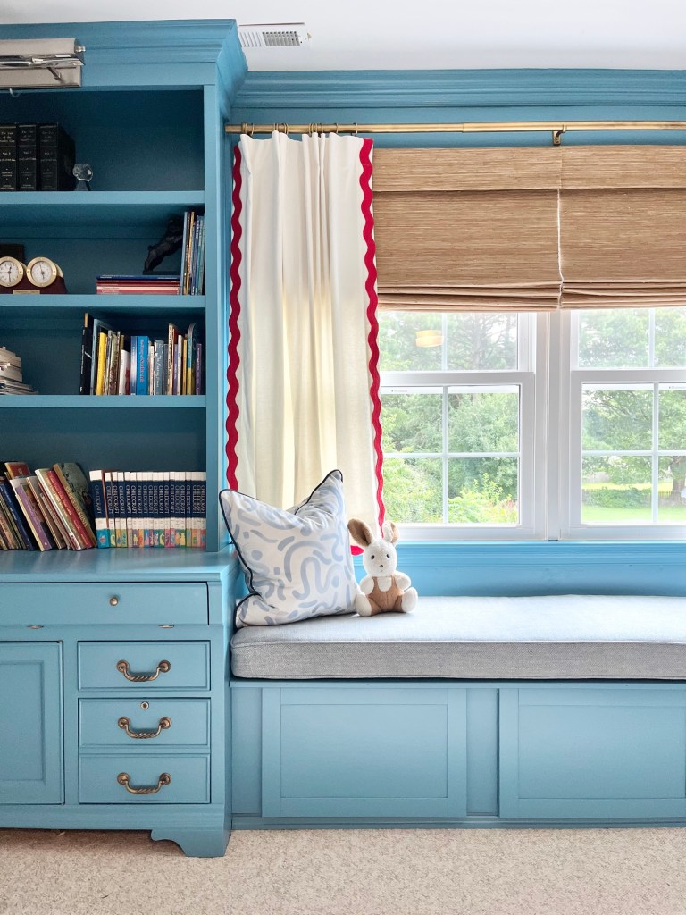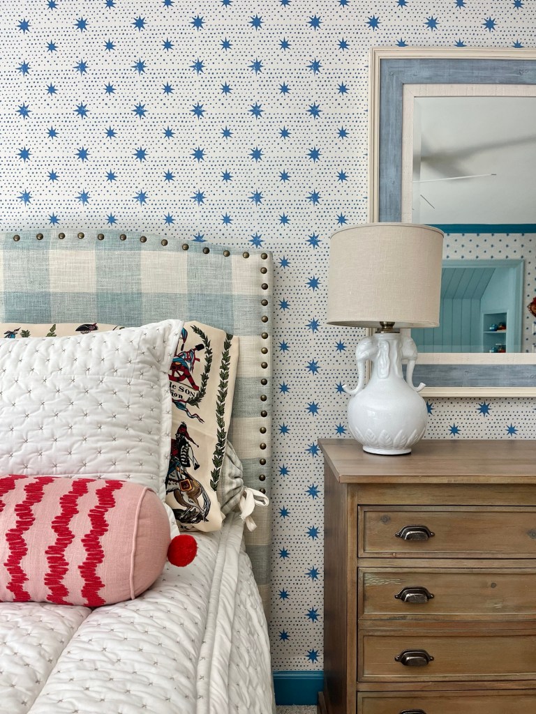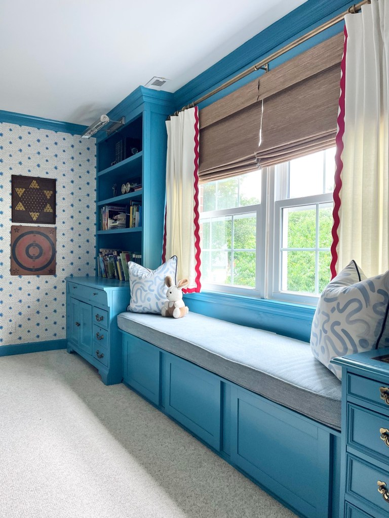 Kid Bedroom Blue check upholstery fabric Upholstered Panel Bed I upholstered using the lagoon check fabric above Double curtain rod Linen Roman shades Wood dresser Fisherman lamp
